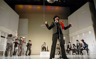 Ez mind rendben is van, de azt gondolom, ez iszonyatos befektetéssel jár. A színpadi tér végül is egy ilyen toalettet, egy luxusillemhelyet idéz, amely pazar kivitelezésben volt létrehozva, amelyben ugyanakkor felfedezhetők egyfajta hagyományos építészet stílusjegyei is. Nyilván nem akarom túlságosan felfedni a részleteket, de van itt még egy sehová vezető vörös szőnyeges út, amellyel mindig minden szereplőnek valamilyen módon kapcsolatba kell lépni.
